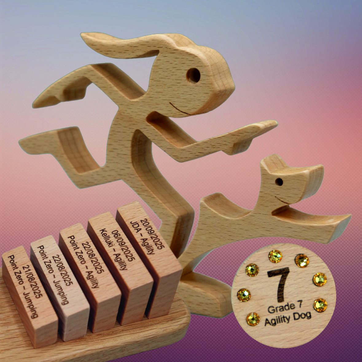Our handmade trophies feature exclusive registered designs to ensure originality and distinction in every award. Options for personalisation and a choice of woods help you design a special trophy for your special dog.